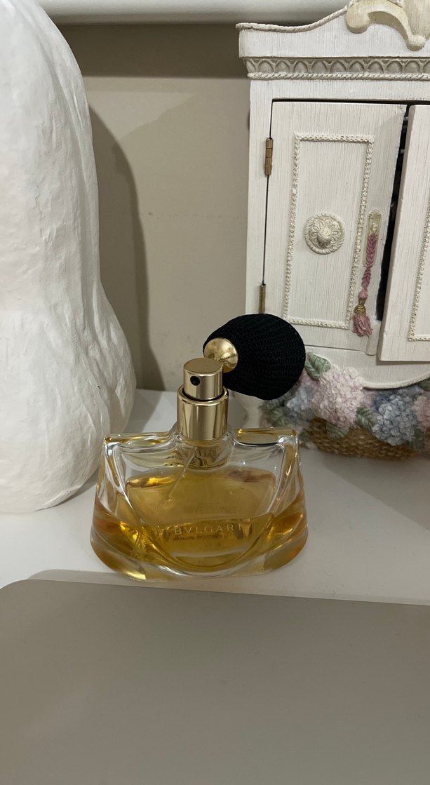 Klasik atomizerli, siyah kumaş pompalı ve altın renkli püskürtücülü Bvlgari kadın parfümü. Şişede amber renkli koku bulunur.