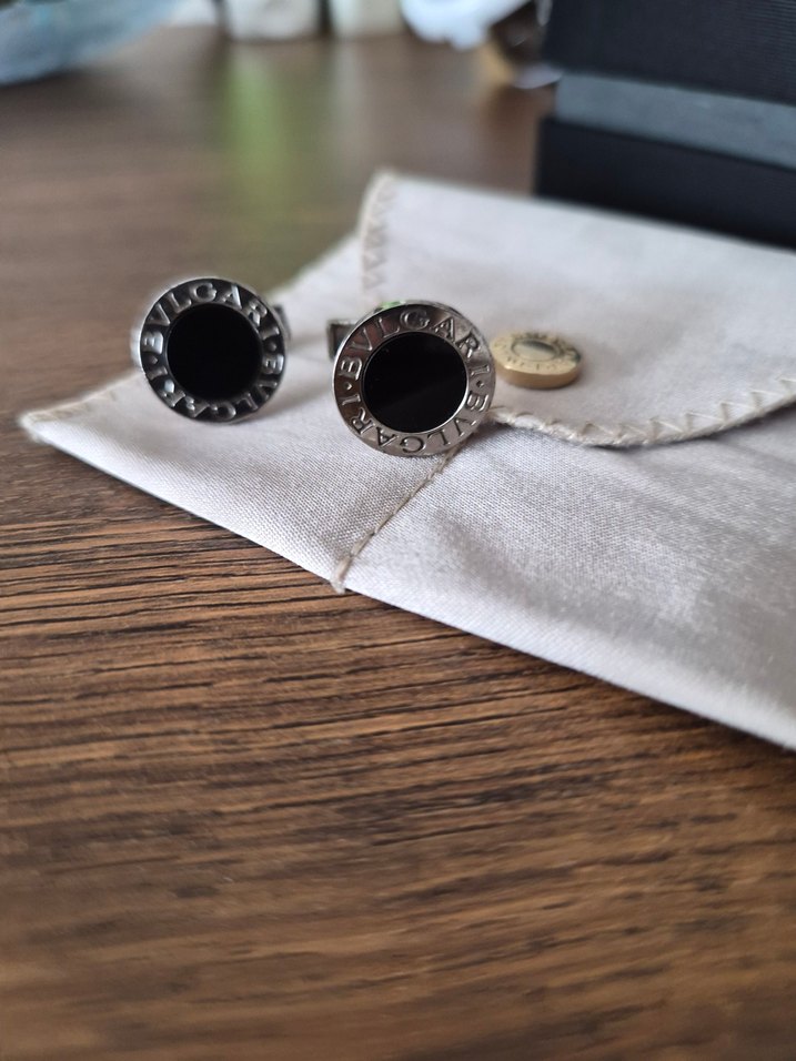 Bvlgari erkek kol düğmeleri, siyah merkez ve marka yazılı gri metal çerçeve ile modern klasik tasarıma sahiptir. Klasik zarafet için uygun. ️