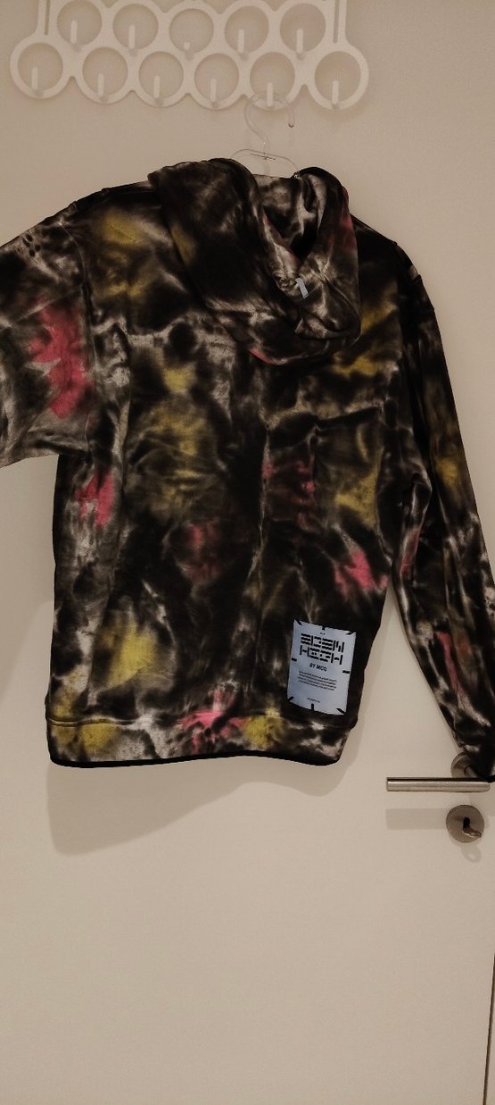 erkek kapüşonlu, uzun kollu, koyu renkli çok renkli batik desenli sweatshirt. Salaş kesim ve düğmeli detaylara sahip, sentetik kumaştan üretilmiştir.