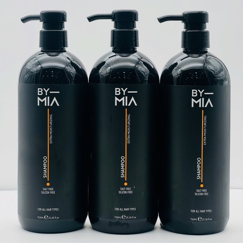 By Mia şampuan, tuzsuz ve sülfatsızdır, tüm saç tiplerine uygundur, ekstra nem sağlar, 750 ml pompalı şişede sunulur.