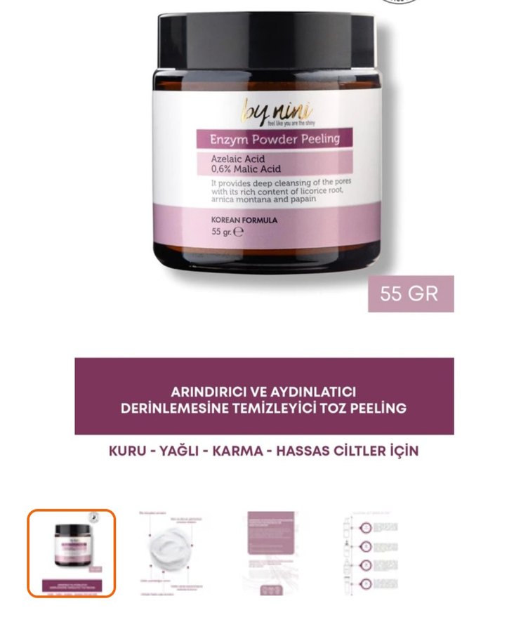 By Nini Enzim Toz Peeling, azelaik asit ve malik asit içeriğiyle kuru, yağlı, karma ve hassas ciltler için derinlemesine temizleyici ve aydınlatıcı etki sağlar. 2 kez kullandım. Şubat'ta almıştım.