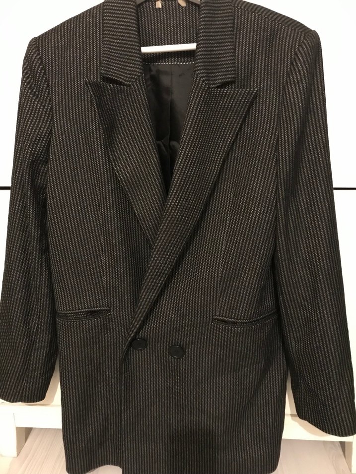 Gri renkli kadın blazer ceket, keskin yaka, çift düğmeli ve uzun kolludur. Çizgili deseni ve midi boyu ile ofis kullanımı için uygundur.
