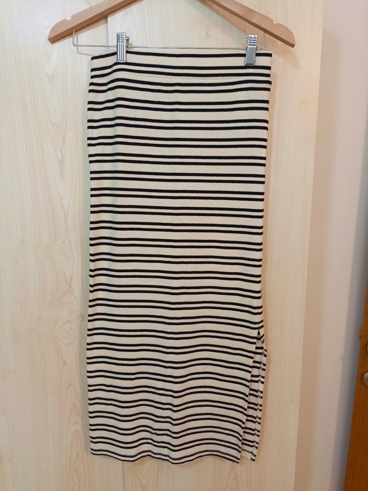 Beyaz zemin üzerine koyu çizgilerle desenlenmiş, fitilli ve vücuda oturan uzun etek. Paris sokak modasına uygun, günlük kullanıma uygun şık bir seçim. yandan yırtmaçlı, boy 80 cm, en 37 cm