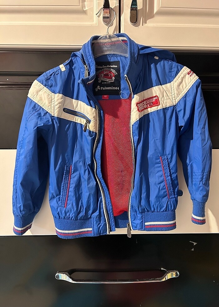 7 yaş/ 122 beden yağmurluk. Çok ince değil , mevsimlik. 2 dışta, 1 içte cebi var. İsmini yazdığımız yerin üstünü karaladık. Başka bir problemi yok.