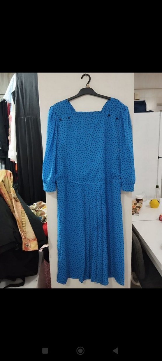 Uzun kollu, V yaka ve düğmeli bu mavi bohem elbise, bol kesim ve vintage tarzı tie-dye desenlidir.