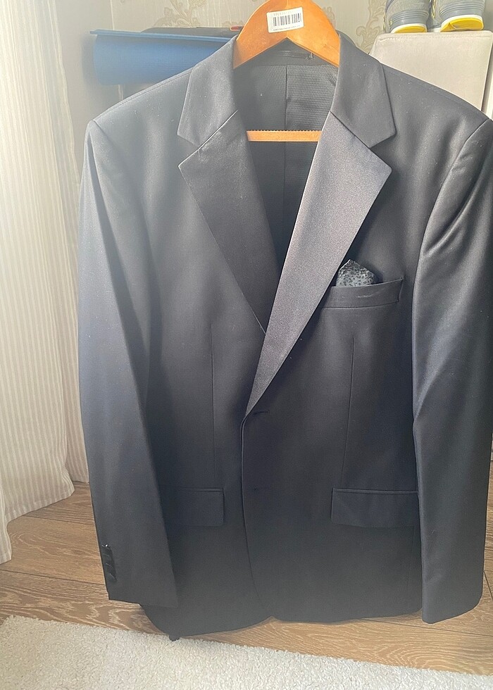1 kere dugunde giyildi. temizdir. normal kaliptir. slim fit degildir. gomlek yakasi temizlik isteyebilir. ceket utu isteyebilir. Pantolon: bel 45, boy 105, paca 23 cm / Ceket: kol:64, boy: 78, iki omuz arasi: 44 cm (dikis aralari mesafe). damat iken 95 kilo 180 boy olculeri ile giyilmistir. rengi parlak siyahtir. ceket yakalarindaki parlak kumas cikarilabilir normal takim olarak giyilebilir.