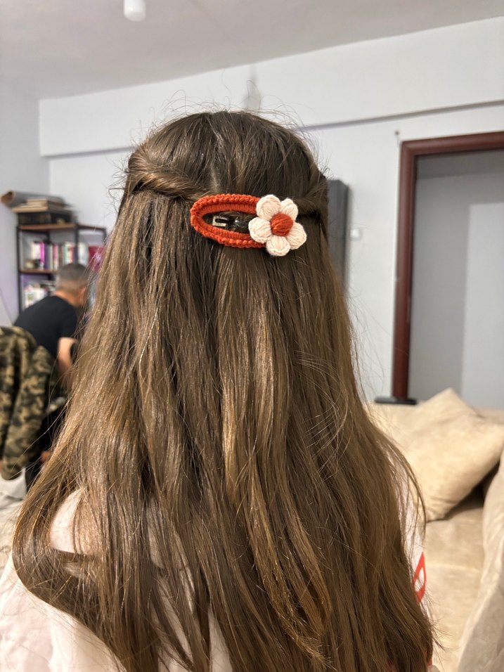 Bej renkli çiçek desenli örgü çocuk toka, bohem ve retro tarzı yansıtır. Saçlara doğal ve şık bir dokunuş katar.