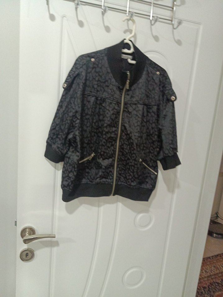 Kadın ceketi, bol kesim, uzun kollu ve yüksek yakalıdır. Gri yılan desenli, ön fermuarlı ve sentetik kumaştan yapılmıştır. boyu 53 cm iki kol arası 52 cm