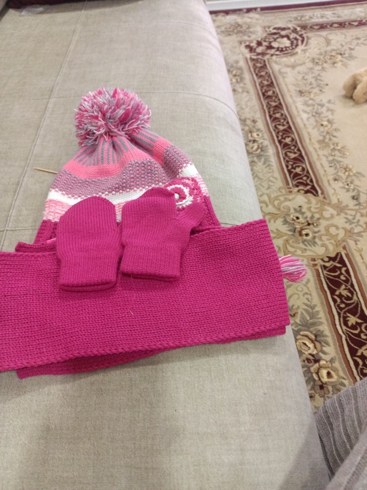 c1Pembe Nakışlı Örgü Çocuk Bere, Atkı ve Eldiven Seti
