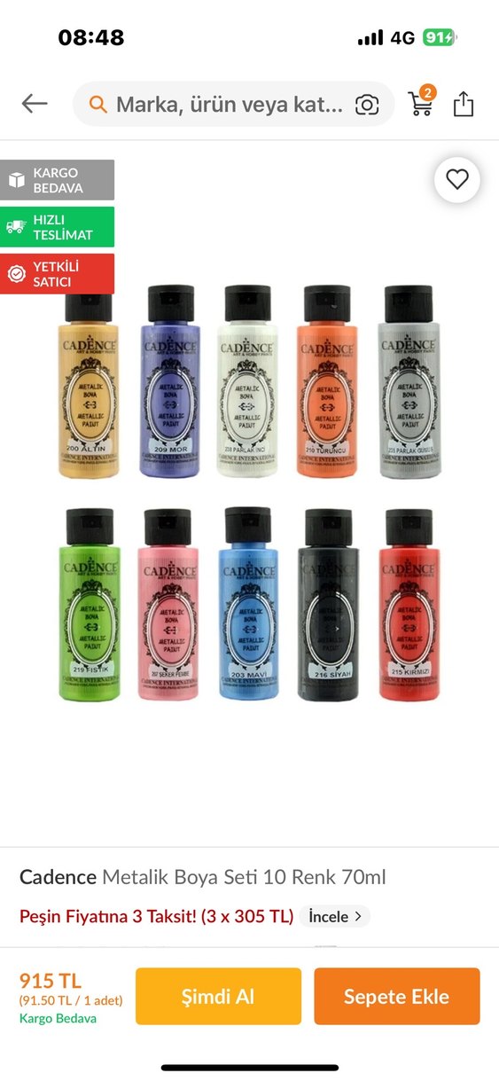 Cadence metalik saç boyası seti, 70ml'lik 10 canlı renk içerir ve parlak bir görünüm sunar. Çok az siyah ve gri kullanıldı.