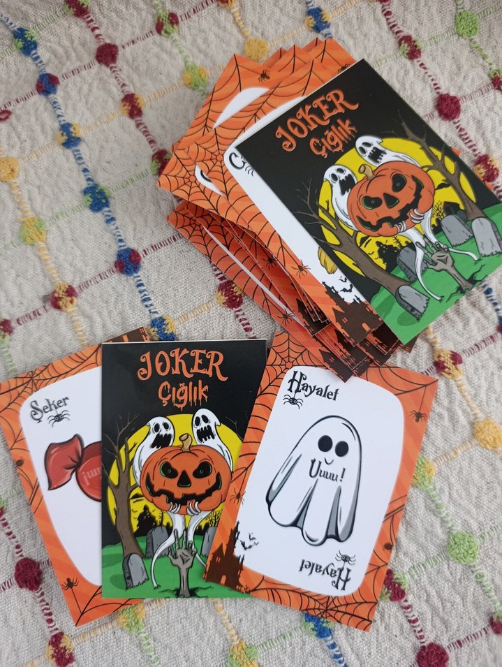 Cadılar Bayramı temalı balkabağı ve hayalet çizimleriyle renkli kart oyunu. Joker, Çığlık ve Şeker kartları içerir.