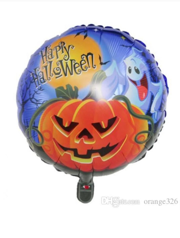 Renkli Cadılar Bayramı balonu, balkabağı ve hayalet figürlü, üzerinde 'Happy Halloween' yazısı bulunur. #halloweenbalon