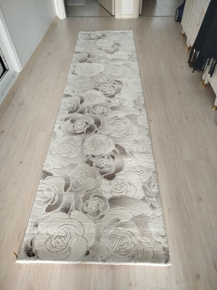 Çağdaş tarzda, bej ve gri tonlarında çiçek desenli halı, mekâna zarif bir dokunuş katar. Yumuşak dokusuyla konfor sağlar.
