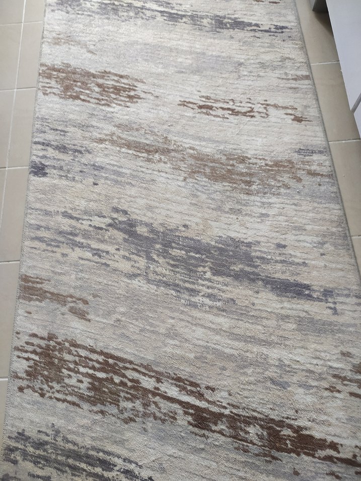 Bej zemin üzerinde gri ve kahverengi tonlarda, desen içermeyen çağdaş tarzda bir halı.