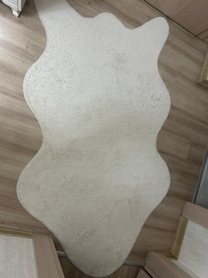 Çağdaş tarzda, bej ve gri tonlarında, düzensiz şekilli ve yumuşak dokulu düz halı. Her odaya zarif bir dokunuş katar.
