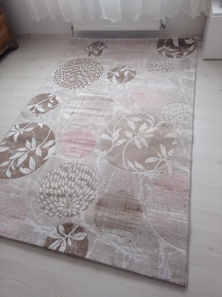 Bej ve gri tonlarında, çiçek ve yaprak desenli dairesel motiflere sahip çağdaş baskılı halı. Her odaya zarif bir dokunuş katar. 231 cm en 148 cm. üzerinde lekeler mevcut yıkama yapılmadı uzun zamandir kullanılmadi marka temsili