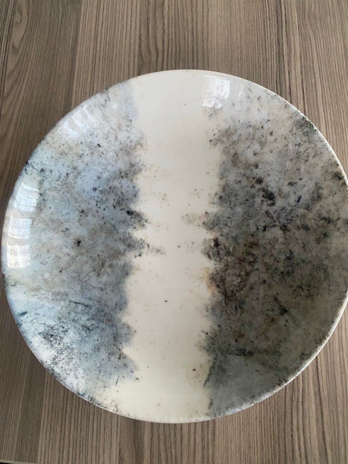 Çağdaş tarzda, bej zemin üzerine gri tonlarda düzensiz desenli porselen tabak. Pürüzsüz yüzeyiyle modern sofralara uyum sağlar. ️