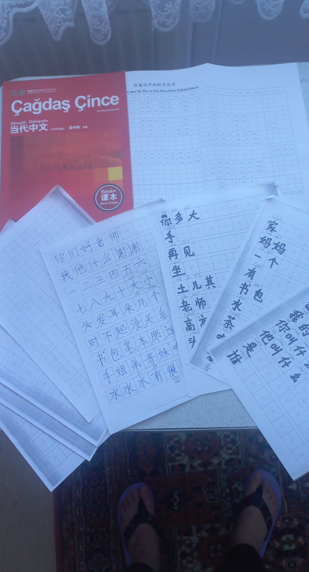"Çağdaş Çince" adlı kitap ile birlikte Çince karakterlerle yazılmış el yazısı deneme sayfaları, dil öğrenenler için pratik yazım örnekleri sunar.