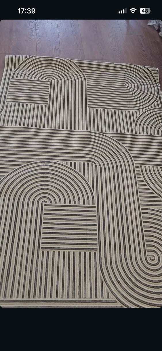 Bu çağdaş halı, kahverengi ve gri tonlarında çizgili desene sahiptir. Kavisli ve düz çizgilerle modern bir görünüm sunar. 120/180 ölçüsünde ınce halılardan
