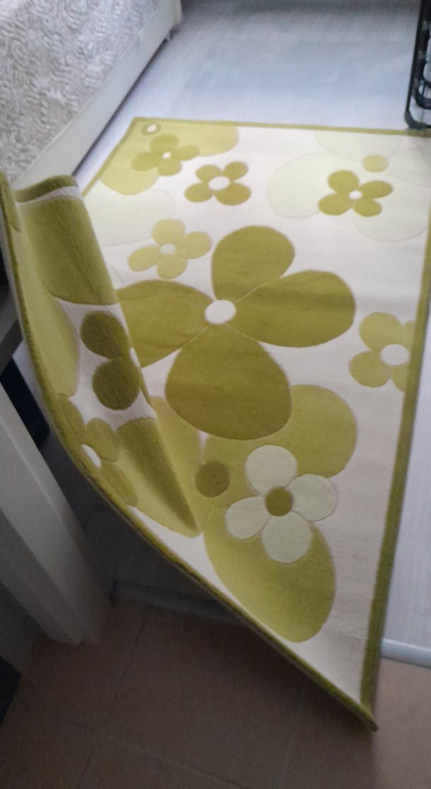 Büyük ve küçük çiçek desenli, açık yeşil çağdaş tarzda baskılı halı. Yumuşak dokulu, ferah bir görünüme sahip.