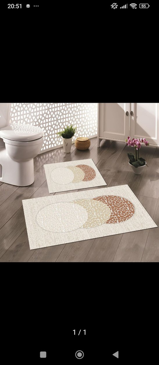 Çağdaş desenli, bej tonlarında baskılı banyo halısı seti. Hafif renkler sakin bir atmosfer sağlar.