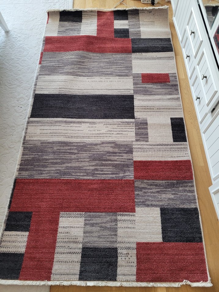 Bu çağdaş halı, gri, siyah ve kırmızı tonlarında desenli bir tasarıma sahiptir. Geometrik şekiller ve soft renklerle modern bir dokunuş sağlar. 120x235 yıkatıp kaldırdım temizdir