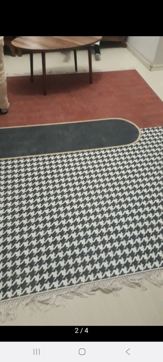 Bu çağdaş halı, gri tonlarda basılı kazayağı deseni ile modern bir dokunuş sunar. Yumuşak dokusu ve püsküllü kenarları vardır.