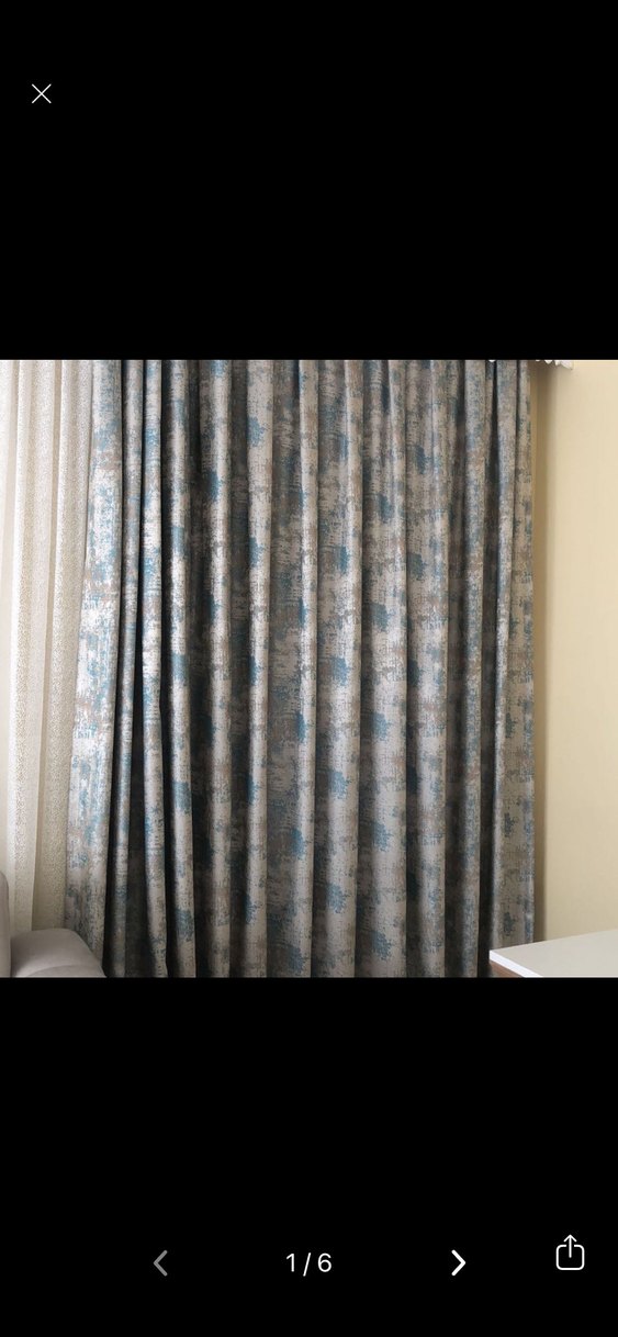 Bu çağdaş perde, gri ve mavi tonlarda batik desen içerir, mekâna ince sanatsal bir dokunuş katar.