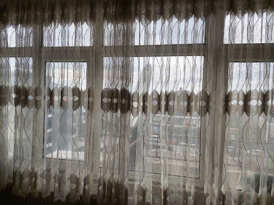 Bu çağdaş perde, krem tonlarda işlemeli desenlere sahiptir. Hafif kumaşı doğal ışığın geçmesine izin verirken mahremiyet sağlar.