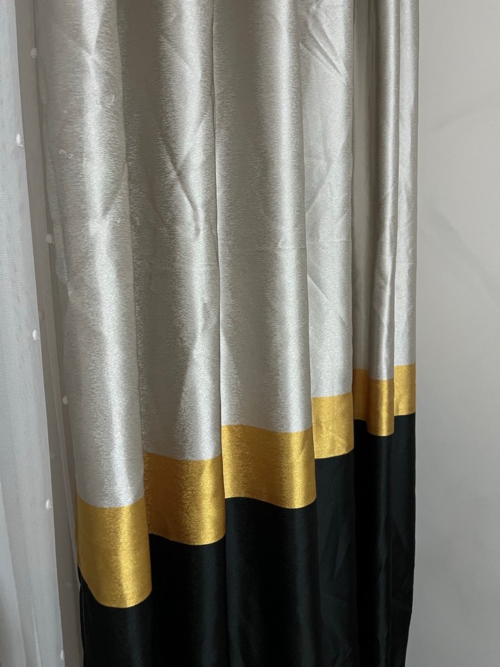 Bu perde, gri ve beyaz tonlarda çağdaş bir tasarıma sahip olup alt kısmında altın ve siyah şerit detayları bulunur. Modern bir görünüm sunar.