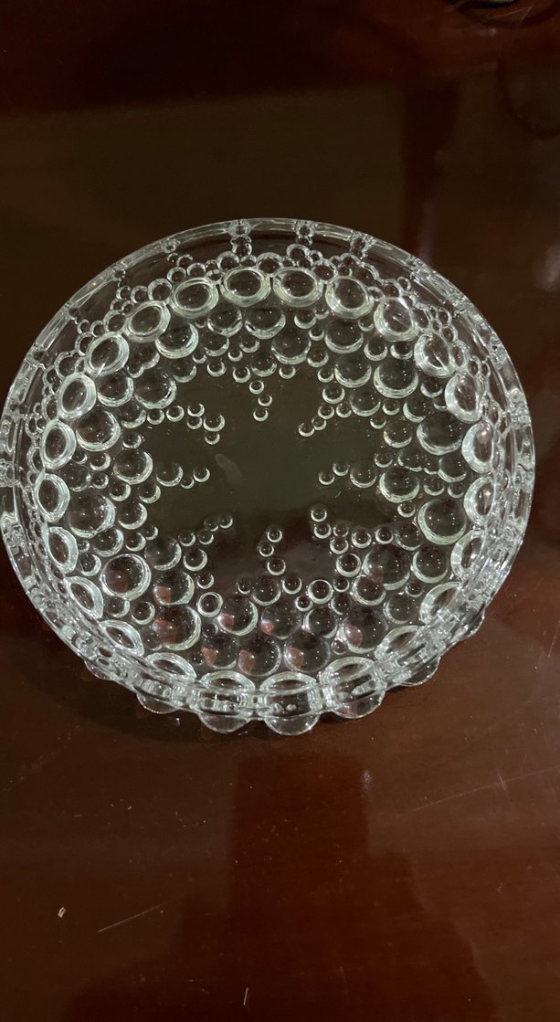 Parlak bej renkte, çağdaş tarzda, kenarlarında kabarcık desenli şeffaf bir tabak. ️