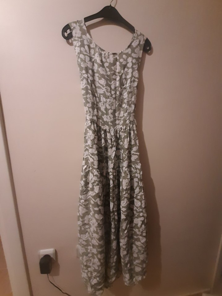 Keten kumaştan yapılmış, uzun ve bol kesim elbise. Kolsuz, drapeli ve straplez yakaya sahip. kamuflaj desenli vintage bohem tarzda. Günlük kullanıma uygun.