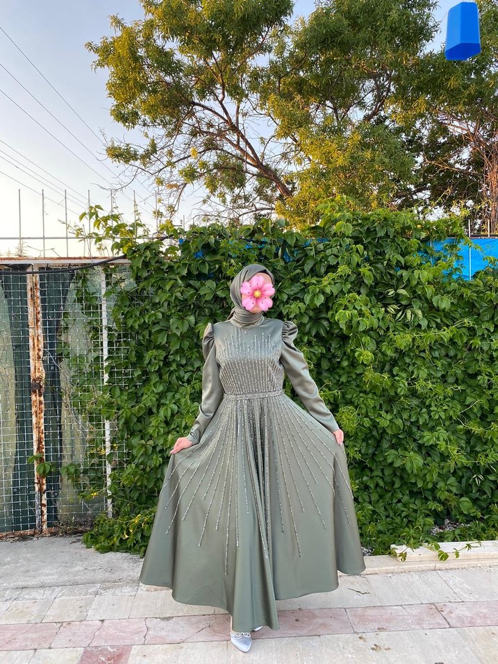 Çağla yeşili taşlı tesettür abiye