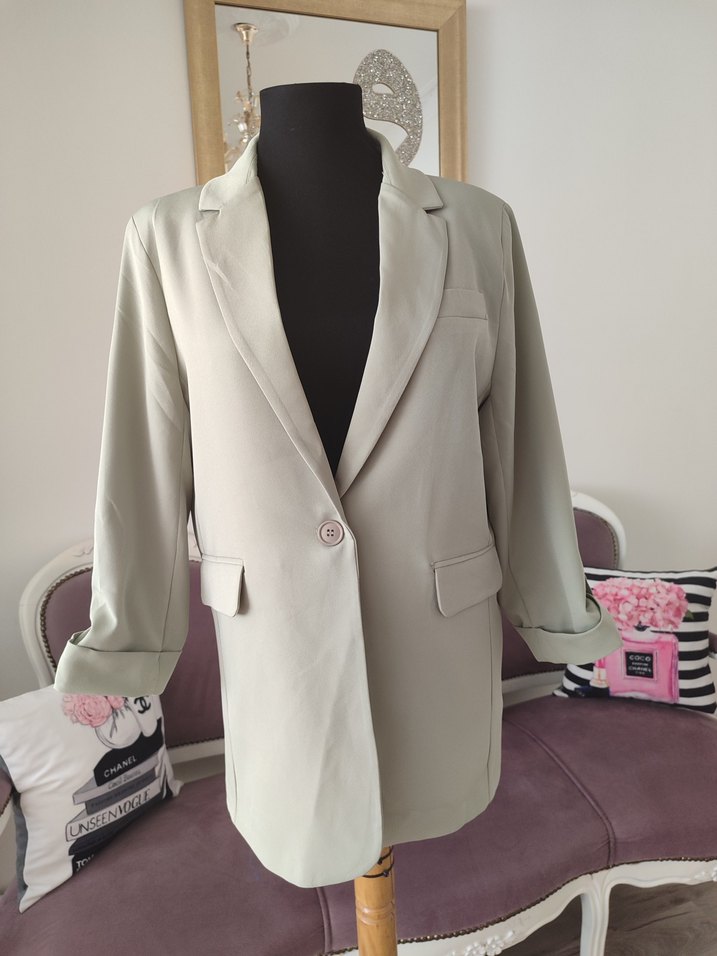 çağla yeşili renkli, düğmeli, uzun kollu kadın blazer ceket. Normal kesim ve midi boy, yumuşak sentetik kumaştan, iş ve gündelik sokak stiline uygun.busem marka