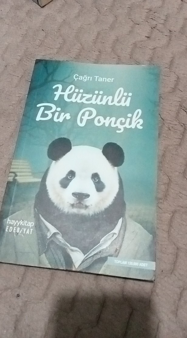 Çağrı Taner'in yazdığı 'Hüzünlü Bir Ponçik' adlı mizah kitabı, insan kıyafetleri giymiş panda kapak resmiyle dikkat çekiyor.
