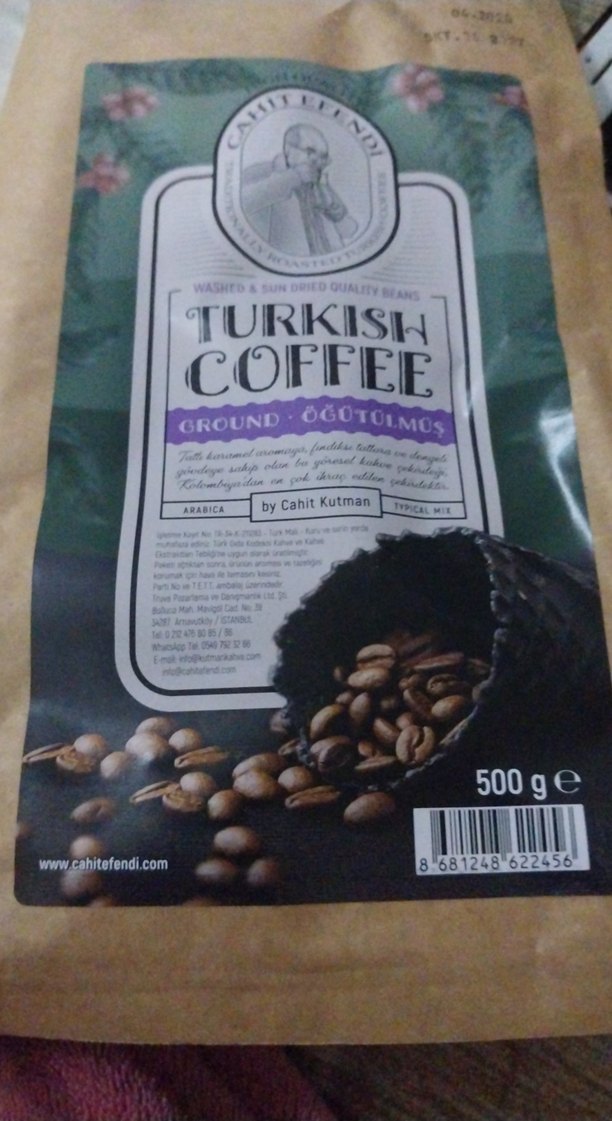 Cahit Kutman tarafından 500g paketlenmiş koyu kahverengi öğütülmüş Türk kahvesi. Geleneksel kahve yapımı için uygundur. ☕