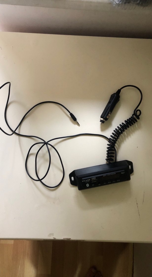 USB, Bluetooth ve MP3 çalma özelliklerine sahip siyah müzik sistemi kontrol ünitesi. Çoklu düğmeler ve spiral kablo bağlantısı bulunur. Genellikle eski tip araçlar içindir çakmak girişli ve sağlam sorunu yok.