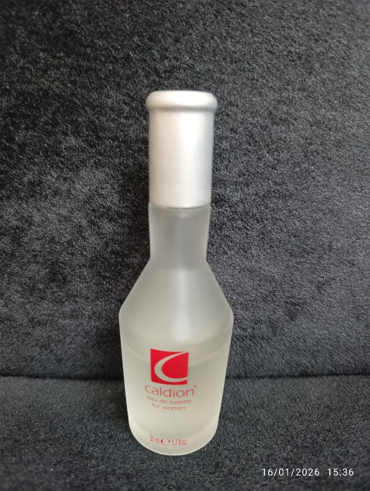 Gümüş kapaklı mat cam şişede 30 ml Caldion kadın parfümü.