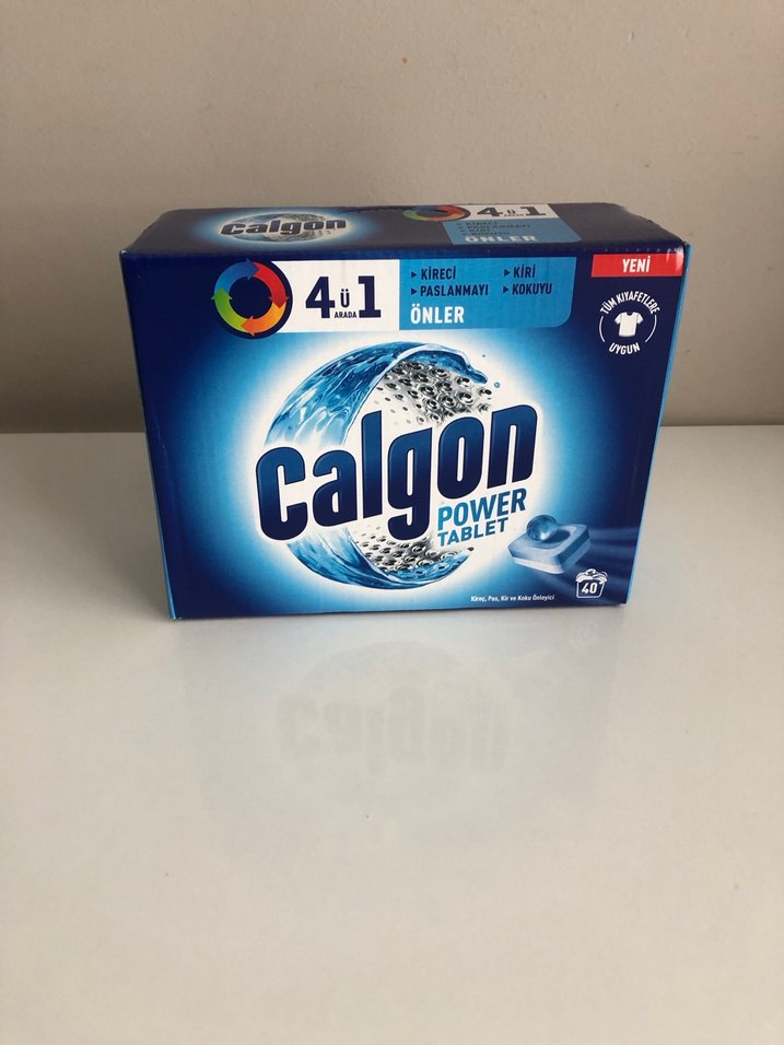 Calgon güç tabletleri, kireç, pas, kötü koku ve kirlenmeyi önleyen 4'ü 1 arada formüle sahiptir. 40 tabletlik mavi kutuda.
