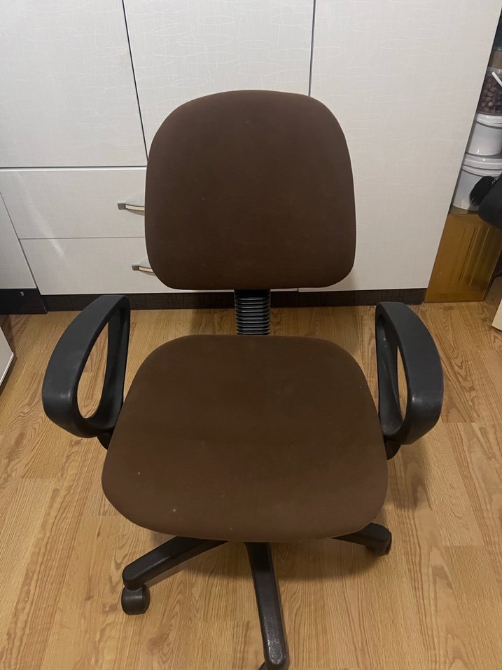 Çalışma koltuğu kahverengi ayarlanabilir ve hareket için tekerlekli ayaklarlara sahip