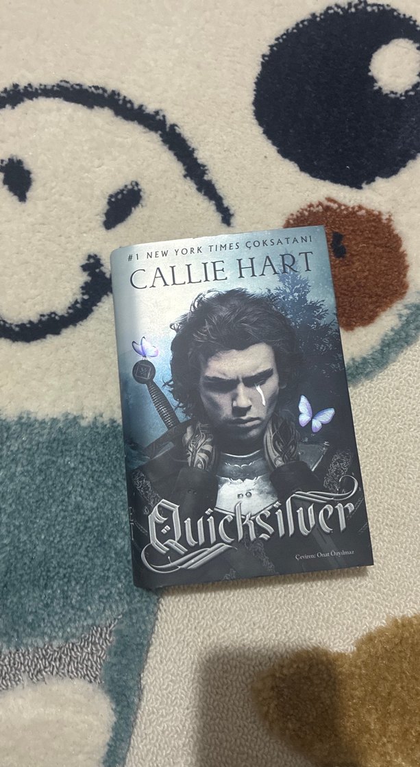 Callie Hart'ın Quicksilver adlı romanı, karanlık ve yoğun kapak tasarımıyla savaşçı karakter ve kelebekler içeriyor.