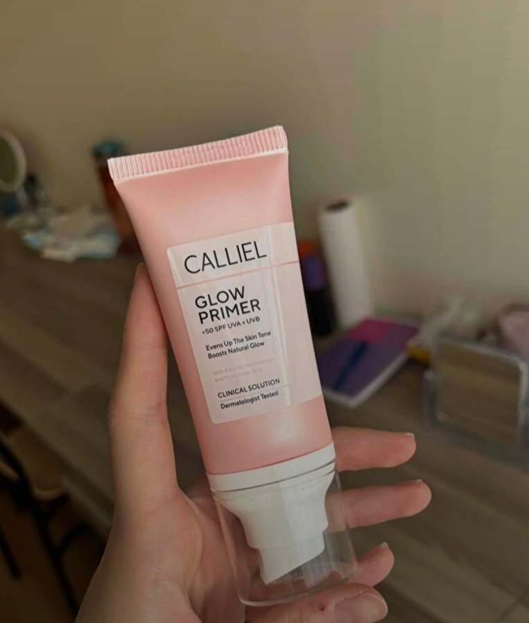 CALLIEL Glow Primer, pastel bej tonunda cilt tonunu eşitler ve doğal parlaklık verir. SPF 50 içerir ve dermatolojik olarak test edilmiştir.