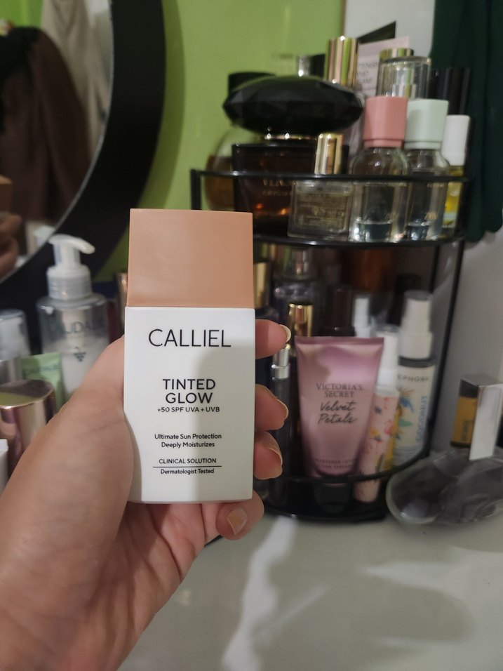 Calliel Tinted Glow BB Krem, açık camel renginde, SPF 50 koruma ve derin nemlendirme sağlar. Parlak bitişlidir ve dermatolog onaylıdır.