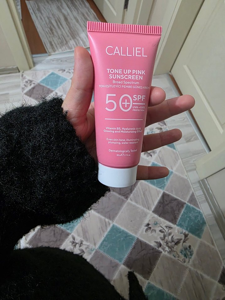 CALLIEL Tonlandırıcı Pembe Güneş Kremi SPF 50+, geniş spektrum koruma sağlar. Vitamin B5 ve hyaluronik asit içerir, cildi nemlendirir ve aydınlatır. Dermatolojik olarak test edilmiştir. ☀️