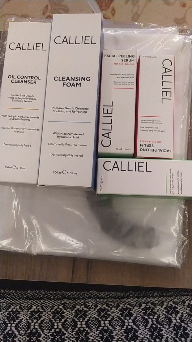 CALLIEL yağ kontrolü temizleyici, niasinamid ve hyaluronik asit içeren nazik köpük ve AHA, BHA, PHA içeren yüz peeling serumu içerir.