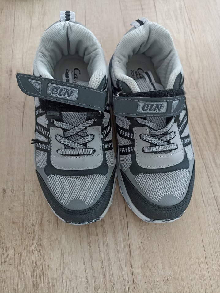 Gri renkli, velcro bantlı erkek çocuk spor ayakkabısı. Kauçuk tabanlı, desen içermeyen sokak stili tasarım. Üzerinde 'CIN' ve 'CUN' yazıları bulunur.