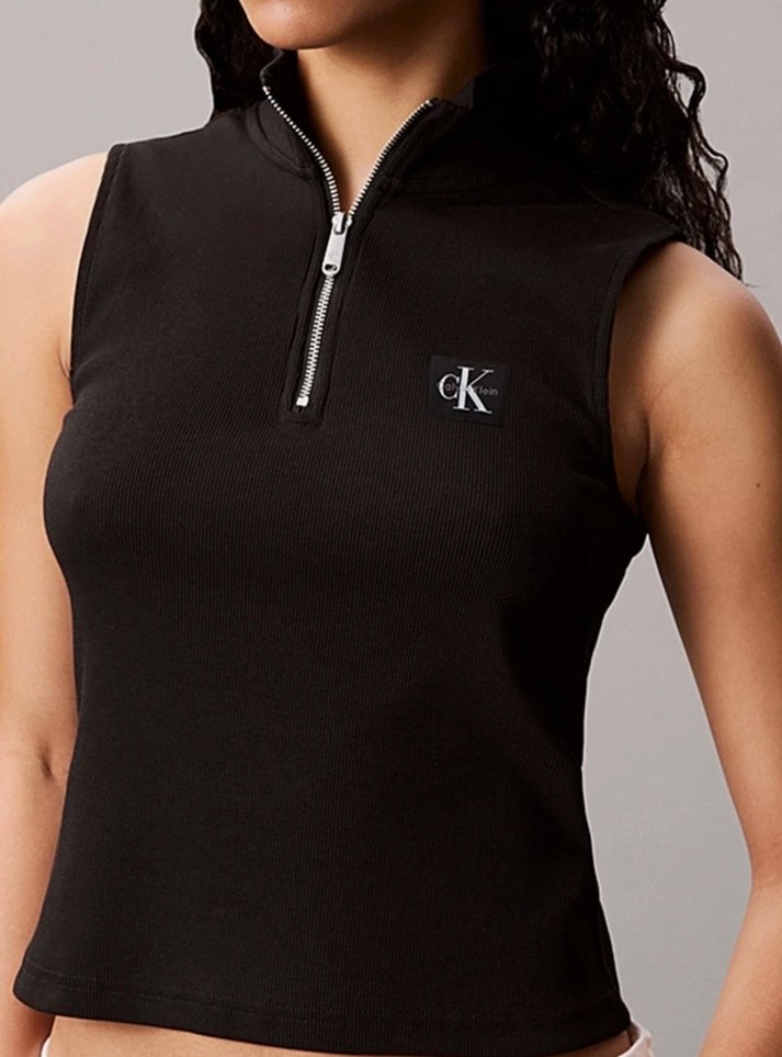 Orjinal etiketli.Fermuarlı ve yüksek yakalı, kolsuz siyah kadın atlet. Parlak görünümlü sentetik kumaştan, cK logosu bulunur. Günlük sokak stiline uygun.