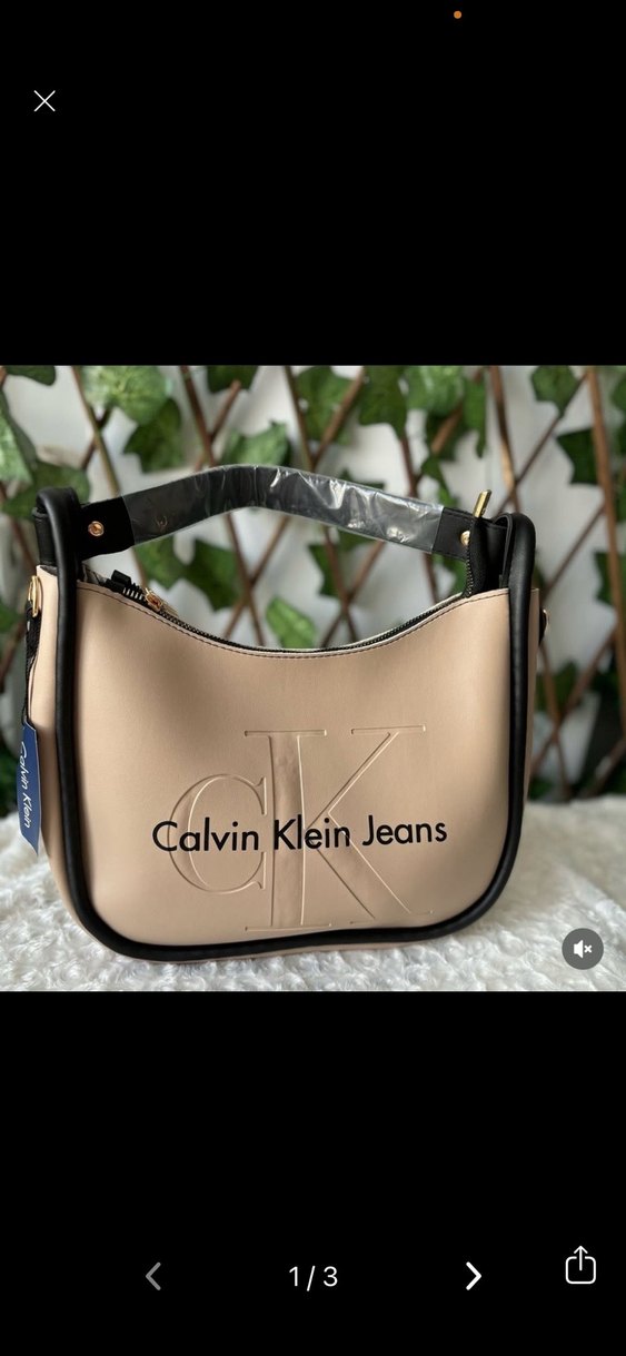Pastel bej deri çanta, tokalı askı ve Calvin Klein Jeans baskılı detaylarla günlük sokak stili için uygun.