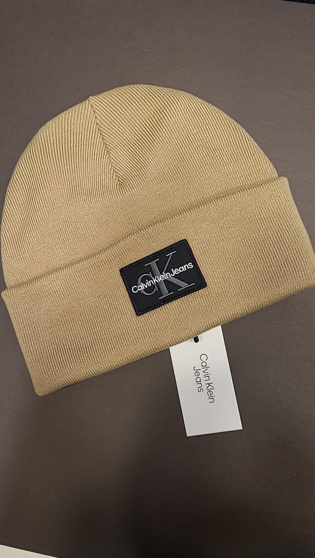 Calvin Klein markalı, yumuşak fleece astarlı, açık bej örgü kadın bere, trend sokak stili için uygun.