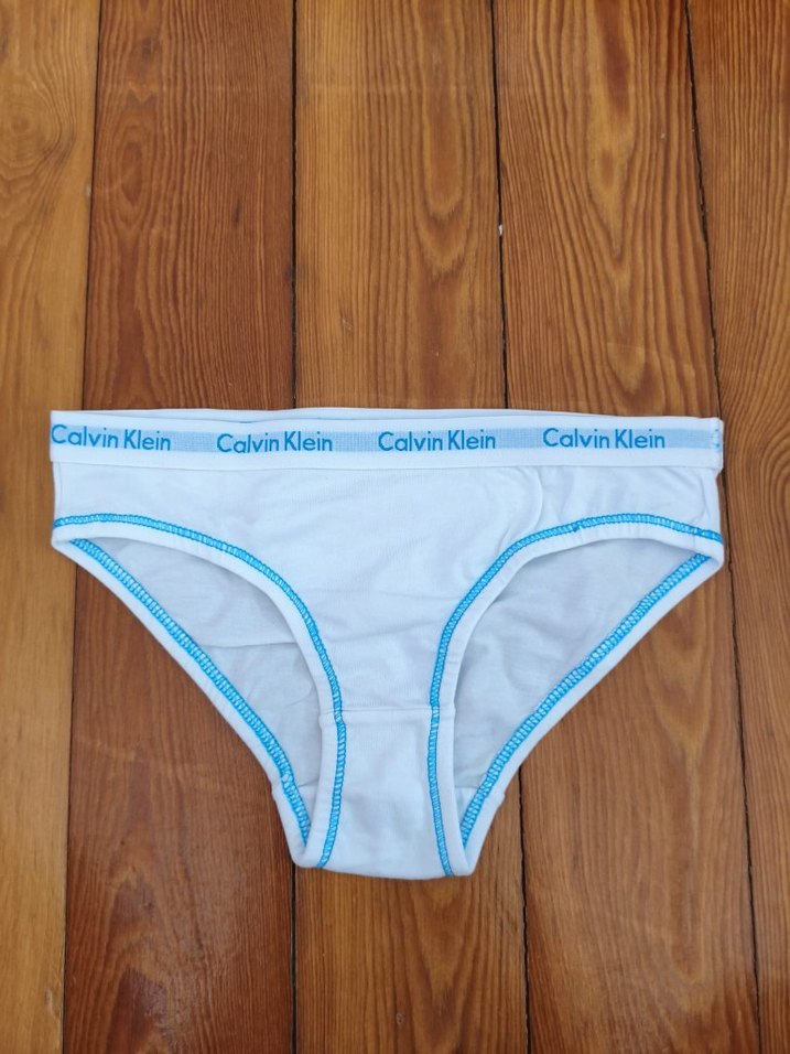 8-10 yaş Calvin Klein beyaz kadın iç çamaşırı, baskılı logo bel bandı ve açık mavi dikiş detaylarıyla, normal midi boyda rahat bir kesim sunar.